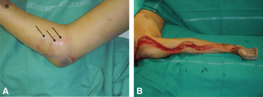 Figure 2. Case 2 (A) Detail of right elbow, edematous, tender, and blistered (arrows); small necrotic area visible at wrist (*). (B) Surgical exploration and fasciotomy of right upper limb extending from neck to hand, with drainage of fluids and debridement of necrotic tissues. Skin and subcutaneous tissue necrosis is visible at wrist. 1